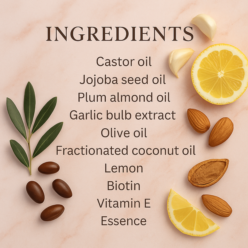 Ingredients: Castor oil, Jojoba seed oil, Plum almond oil, Garlic bulb extract, Olive oil, Fractionated coconut oil, Lemon, Biotin, Vitamin E, Essence.